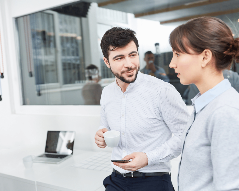 Sophie steht in der Teeküche und sagt zu einem Kollegen: